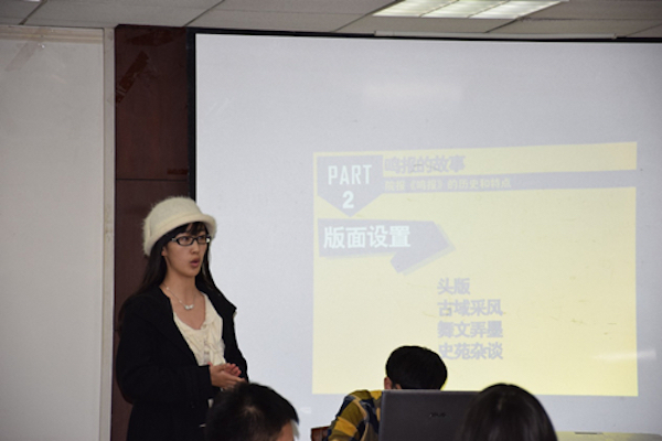 交流会的第一部分是社团展示,各个员工媒体社团采用PPT形式介绍各社团基本情况。《春秋人文报》主编吴姚函首先从报纸沿革、部门设置、报社运营、社团活动等方面对《春秋人文报》进行了全方位介绍。随后,其他两个员工媒体社团的代表也向大家展示了各自社团的特色和风采。细致精彩的展示,使我们对其他兄弟社团的情况有了更进一步的了解,为今后深入合作提供可能。