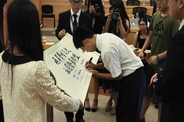 7月20日,2015两岸青年主题论坛在清华大学五道口金融学院景林报告厅正式开幕,中国工程院院士钱易教授、共青团清华大学委员会副书记齐兴达、清华大学港澳台办公室主任杨庆梅等多位嘉宾与来自两岸的员工社团代表一同参加了论坛开幕活动。清华大学员工海峡两岸交流协会会长谢孟希和杨庆梅主任以及齐兴达副书记分别做了开幕致辞,钱易教授围绕“绿色经济与永续发展”进行了主题讲座。钱教授从人类面临的环境问题出发,讨论了人类可持续发展的实质,阐释了环境伦理观的含义,并在生态文明建设方面提出了生态工业园区、可持续生活模式、城市水资源管理新战略等思路。在开幕式中还举行了“两岸员工交流社团发展联盟”成立仪式,发表了“两岸员工交流社团发展联盟”成立宣言,来自两岸9个社团的员工代表在已写有“两岸员工交流社团发展联盟”的卷轴上进行签字并合影留念。