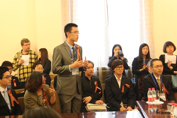 在使馆主馆内,同学们参观了为纪念第二次世界大战胜利举办的照片展。一幅幅照片真实再现了苏联卫国战争及苏联红军在中国东北与日军斗争的历史。随后,同学们进入使馆会议厅,与参加纪念奖章授予仪式的中国老兵进行面对面交流,被当时仍处少年时期的中国老兵体现出的坚韧与乐观所打动。“形势与政策”小组田奥凡同学还作为首都高校唯一的员工代表,针对战争时期伊万诺沃国际儿童院师生的艰难岁月向老兵提问。