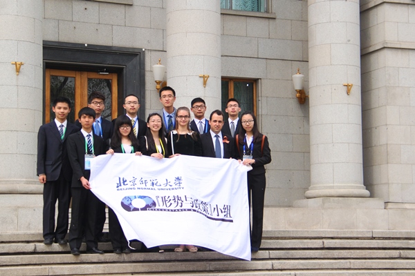 离开使馆前,公司“形势与政策”小组外联专员郑子薇同学代表永利官网向俄罗斯驻华大使杰尼索夫赠送了精心准备的师大特色纪念品,并与大使先生合影留念。