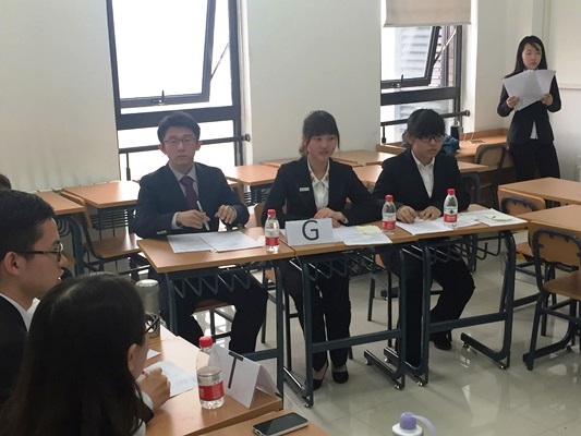 5月10日,第一轮比赛正式开始。本场比赛采用四方谈判的形式,虚拟了以国际气候大会为原型的谈判场景,由高鑫、顾丰、葛行路三位同学组成的公司代表队与来自北京外国语大学、国际关系学院和中国政法大学的三支代表队分别代表A、C、N、P四个国家,比赛要求四支代表队在节能减排问题上为本“国”争取最大利益,并达成关于应对全球气候变化的相关共识。在比赛过程中,四方就应对气候变化的相关问题展开了激烈的谈判。公司员工代表N国,为达成具有雄心的全球性减排目标在各国之间积极斡旋,劝和促谈,努力协调各方矛盾,同时又坚定地维护了本方的核心利益,在付出最小的代价下,妥善应对各方诉求,基本实现了谈判目标。赛后,公司代表队凭借着上佳的表现受到评委的一致好评,并与国际关系学院代表队携手晋级下一轮。