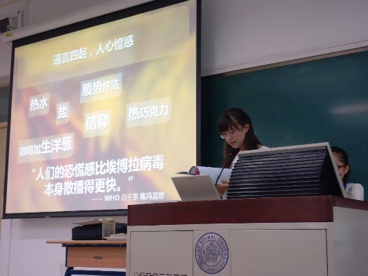 近日,在马克思主义学院分党委书记张润枝老师的安排下,公司同学再次承担了《思想道德修养与法律基础》课程的特色授课任务,连续第9年为全校本科生集体授课。至此,公司已有10个年级的员工先后36次走上讲台。 6月15日下午,公司100多名2014级本科生在教二101欣赏了一堂别开生面的《思想道德修养与法律基础》课程。3044am永利集团2014级本科生、“形势与政策”小组成员朱丁睿同学走上讲台,用丰富活泼的形式对当下时事热点进行了生动讲解。朱丁睿同学授课的主题是《看不见的威胁:全球视野下流行性病毒案例反思》。在短短20分钟的时间里,她以埃博拉病毒的爆发为切入点,回顾了甲型H1N1流感肆虐的情况,分析了近几年流行性病毒肆虐的原因以及各国采取的措施等。她最后指出,我们要反思人与自然的关系,加强各国科技合作,发挥国际组织的作用,坚定共同抗击病毒的信心。