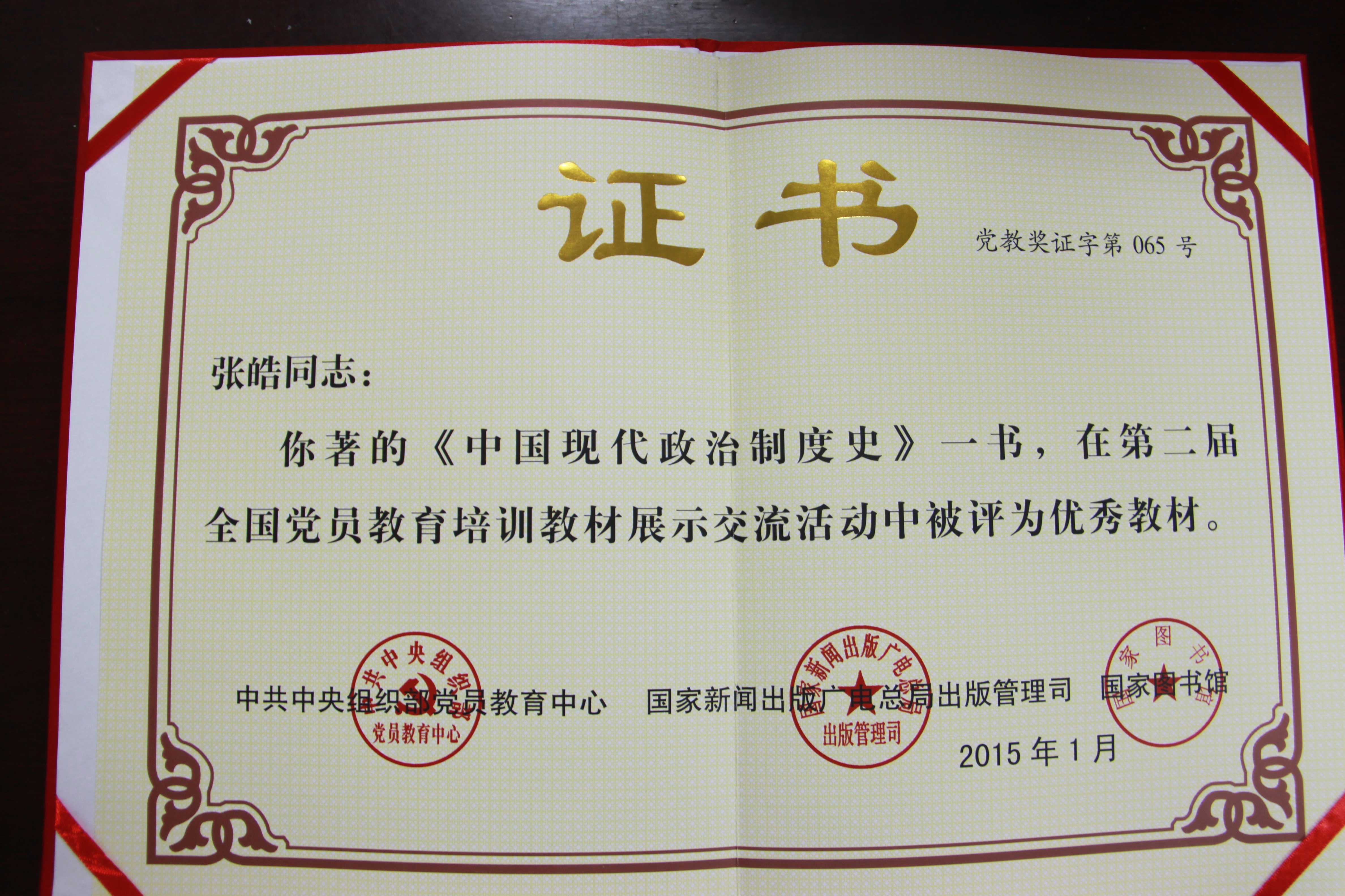 近悉,公司张皓教授所著的《中国现代政治制度史》在中第二届全国党员教育培训教材展示交流活动中被评为优秀教材。该奖项由中共中央组织部党员教育中心、国家新闻出版广电总局出版管理司、国家图书馆联合评出。