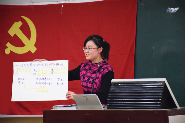 研讨会第二阶段是小组汇报讨论成果。各位代表通过展示谈论成果,分析学习心得。15级预备党员艾烨同志认为要丰富思政课的内容和形式,使得同学们能够正确认识世界和中国发展大势、把握中国特色社会主义的历史必然性、衷心拥护党中央的领导。14级入党积极分子耿佳丽同志,从高校培养什么样的人、如何培养人以及为谁培养人三个方面解读总书记讲话内容。她认为老员工要自觉接受思想政治教育,做中国特色社会主义合格建设者和可高接班人。在各组同志展示完之后,支部书记孟蕾同志作了总结发言,她提出支部要坚决贯彻习总书记的讲话精神,以实际行动做好一名优秀的共产党员和当代老员工。