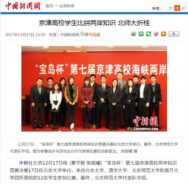本次比赛由北京大学港澳台办公室作为指导单位,北京大学台湾研究会主办。来自北京大学、清华大学、南开大学和永利官网的12名同学参加了此次比赛,多家媒体的记者进行现场报道。