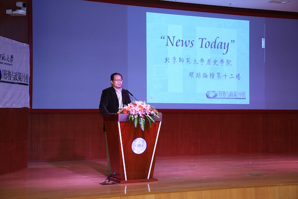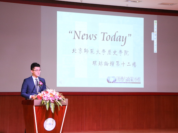 “News Today”3044am永利集团环球论坛是3044am永利集团依托“形势与政策”小组推出的一项特色精品活动。自2006年首次举办以来,环球论坛已陪师大学子走过了十一载春秋,在全校、乃至北京高校范围内都产生了积极反响。十一年来,共有66位主讲人登上过讲坛,而他们背后的参与者则有三百多人。环球论坛不仅更好地建设了“形势与政策”课程的第二课堂,拓宽了同学们的知识视野,也在兴趣的基础上培养了同学们主动学习、深入思考、勤于表达的习惯,培养了团队间的互助精神,更让同学们充分依托历史学科厚重的底蕴和社会情怀,以“博古通今,胸怀天下”时代精神为己任,展现了青年学子积极向上、关注时事的良好风貌。在论坛上表现出色的同学,将有机会代表小组走上“形势与政策”课程的讲台。十一年以来,已有8个年级的24位同学借助环球论坛提供的平台,为公司本科生授课,受众达千余人。