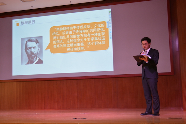 第二组代表、法学院2017级孟子煜同学以《两岸关系走向何方——从吴敦义当选国民党主席说开去》为题,分析了吴敦义当选中国国民党主席以来台湾政坛的格局,国民党内部的情况,以及台湾的青年一代们对大陆、对祖国统一的看法。他指出,“文化台独”是一小部分极端的“台独分裂分子”对“一个中国”的挑战,我们必须对此抱以警惕。在展示的最后,孟子煜同学声情并茂地朗诵了刚刚去世的台湾著名诗人余光中先生的《当我死时》,展现了热爱祖国、渴望统一的台湾同胞的心声,令人动容。