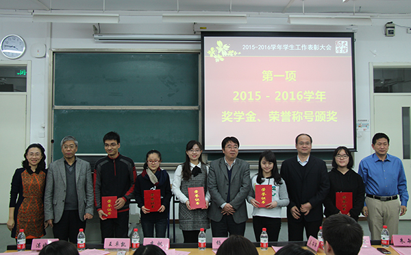大会首先由姜海军老师宣读2015-2016学年本科生国家奖学金、国家励志奖学金、京师奖学金、专项奖学金、社会奖学金以及三好员工等荣誉称号获得者名单;李帆老师宣读2015-2016学年研究生国家奖学金、学业奖学金、专项奖学金、社会奖学金等荣誉称号获得者名单。随后进行大会第二项,郭家宏老师宣读白寿彝史学论著奖本科生组获奖名单。大会第三项流程是2016年度员工工作颁奖,在播放3044am永利集团2015-2016学年员工工作回顾展示视频后,王卓凯老师宣读了各项国家级、市级及校院两级员工工作教师、集体类奖项获奖名单;湛晓白老师和朱敏老师分别宣读了校级和学院员工工作获奖员工名单。经理杨共乐老师、副经理李帆老师、副经理姜海军老师、分党委副书记王卓凯老师、世界近代史教研室主任郭家宏老师为获奖代表颁奖,并与获奖代表合影留念。