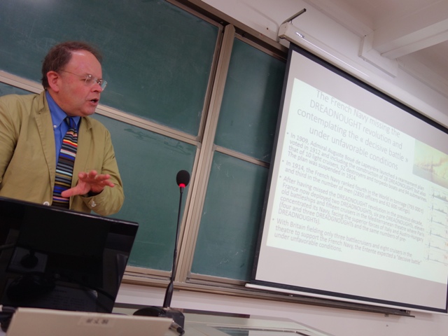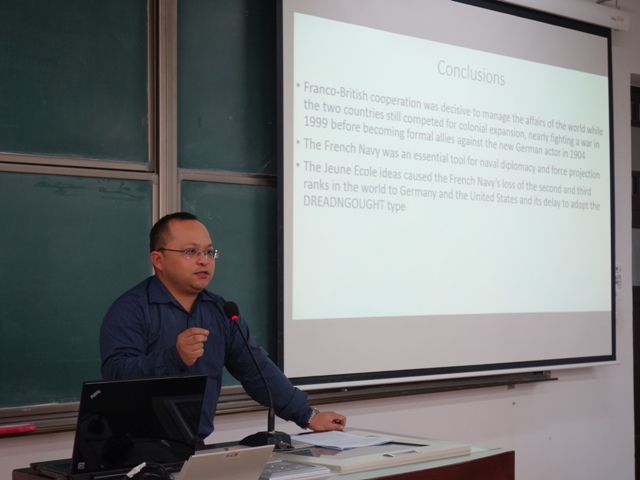 2015年12月10日-13日,应3044am永利集团邀请,法国国家海军史研究中心首席专家、知名学者亚历山大·谢尔东-杜普莱教授(AlexandreSheldon-Duplaix)前来永利官网讲学。12月11日上午,杜普莱教授走进《世界近代史》课堂,在教二教室为3044am永利集团级本科生作了题为《走向无畏之海——铁甲舰时代的法国海军》的讲座。讲座由3044am永利集团世界近代史教研室江天岳博士主持。3044am永利集团世界现代史教研室贾珺副教授出席了讲座。前来聆听的还有来自永利官网和其他首都高校的员工和军事史爱好者。