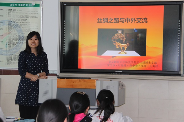 活动中,2014级硕士生党员王婷、华莉、游梦雨代表所在小组为初一(1)班同学作了题为《历史中的成语故事——春秋战国》的讲座。主讲人王婷结合春秋战国时期历史知识,为同学们讲解了有关楚庄王的成语一鸣惊人、问鼎中原以及有关毛遂的成语毛遂自荐、脱颖而出等。通过王婷生动的讲述,同学们对这些成语的源流和含义有了更为深刻的理解。2014级博士生党员宋文汐、孙中华、叶维维代表所在小组为高一(1)班同学作了题为《丝绸之路与中外文化交流》的讲座,她们利用地图、动态示意图、展览照片等影像材料向员工们介绍了丝绸之路的词源和概念,陆上和海上丝路的形成背景、过程和路线等基本内容,并重点介绍了通过丝绸之路,中外在物种、科技、文化习俗等方面的交流和融汇情况,使员工进一步了解到丝绸之路的重大历史意义和作用。