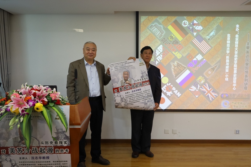 纵观沈志华教授一个多小时的精彩演讲,既有对国际大格局的分析,又有对外交关键细节的描摹,其鞭辟入里的分析得到了在座师生的好评。在随后的提问环节中,沈教授就战后西欧国家与苏联的关系、斯大林对“世界革命”的态度等问题做了进一步探讨。李兴教授在讲座最后进行了总结,认为沈教授的讲解将历史与现实、内政与外交、政治与经济有机结合起来,特别是关注到大国的国内政治生态在其对外关系中的作用,对于国际关系史研究具有重要启示。讲座结束之际,沈志华教授欣然接受了陈奉林教授代表主办方赠送的讲座海报。