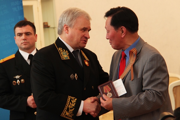 下午四时许,纪念奖章授予仪式在使馆主馆二楼白厅隆重举行。毛泽东女儿李敏、刘少奇女儿刘爱琴,瞿秋白女儿瞿独伊、任弼时女儿任远芳等32名老一辈革命家的后人从俄罗斯驻华大使安德烈·杰尼索夫手中接过荣誉奖章。杰尼索夫大使代表俄罗斯总统普京发表讲话。他表示,俄罗斯和全体俄罗斯人民感谢这些中国老兵为伟大卫国战争胜利做出的贡献,并指出:“我们国家会始终铭记那些曾经保卫和解放苏联、为反法西斯战争做出贡献的英雄,无论他们来自哪些国家。”杰尼索夫大使最后强调,两国青年要牢记这段历史,因为这段历史是两国共同的根。全国政协副主席王正伟在讲话中指出:“中俄两国人民应珍视在第二次世界大战中用生命和鲜血结下的牢固友谊,共同捍卫二战成果和国际公平正义”。伊万诺沃国际儿童院经理、中国老兵代表也先后发言。全体人员为二战烈士默哀一分钟。仪式结束后,同学们参加了使馆招待会,品尝了正宗的俄罗斯美食。