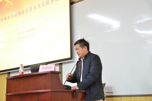 演讲主题为“网络时代的舆论引导与文化领导权”。围绕这个主题,赵璐璐老师首先对传统舆论生态进行了分析,认为传统的舆论生态具有垂直、封闭、大一统等特征。并指出随着互联网的兴起,这一传统生态被打破,由此引发的对舆论的管理也从管理媒介转变为构建良好的舆论生活。接着,老师又分阶段讲到当前的舆论生态。最后赵老师指出在舆论影响不断扩大的时代环境下,掌握文化领导权至关重要。这有利于增强国际话语权,构架融通中外的新话语表达的桥梁。掌握文化领导权要求我们讲好中国故事,讲清历史传统。
