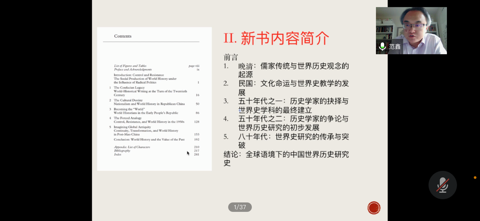 2021年5月16日晚,应公司倪滕达副教授的邀请,美国纽约州立大学弗雷多尼亚分校历史系范鑫副教授通过网络平台为师生们作了一场精彩的专题讲座。该讲座以“世界历史与中国认同”为主题,系“京师史学名家前沿系列讲座”之一。