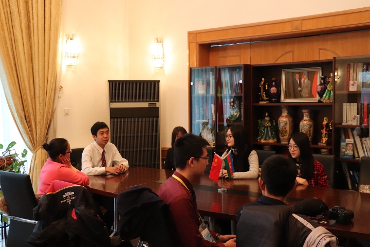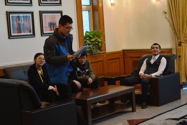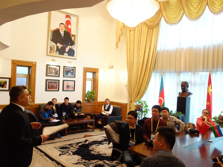下午3时许,公司师生一行来到阿塞拜疆驻华使馆,受到使馆文化与高等教育专员马乐林·卡查耶夫(Marlen Gachayev)的热情迎接。在使馆会客厅,大家首先一同观看了介绍阿塞拜疆的短片。该片集中展现了阿塞拜疆壮美的自然风光、丰厚的历史文化底蕴和充满活力的现代生活,让大家从情感上接近了阿塞拜疆这片东西方文化异彩纷呈、传统与现代生活交相辉映的土地。