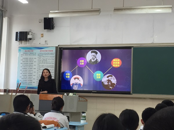 2015级博士生支部刘惠、郭蔚然、张泓林为高二理科班授课。主讲人刘惠围绕恭王府这一主题,以恭王府的概况、等级规制、主人变迁、满族萨满信仰、恭王府所体现的娱乐生活及恭王府的建筑文化等几个话题为主线。同时与恭王府的具体建筑如锡晋斋、大戏楼、后罩楼等相结合,讲述了恭王府的历史与文化。2015级硕士生第一党支部白佳鑫、苏浩浩、窦芳丽为高二一班、二班授课。主讲老师白佳鑫以“一座恭王府,半部清朝史”为主题,将恭王府的历史变迁分为和珅时期、奕?时期和共和国建立后的时期三个阶段。不仅使员工了解了恭王府的基本建构,还与清朝中后期的衰落、晚清第二次鸦片战争、洋务运动等重大历史事件相联系,丰富了员工对中国近代历史的认知。2015级硕士生第二党支部段钰山、左会平、许若潇为高二三班、四班授课,由段钰山任主讲老师。她以“恭王府的前世今生”为题,讲解了恭王府的历史沿革,介绍了和珅宅第、庆郡王府和恭亲王府。紧接着,段钰山详细讲解了恭王府解放后的发展、变化以及恭王府的文化底蕴。同学们积极配合三位老师,课堂氛围活跃,师生互动频繁。